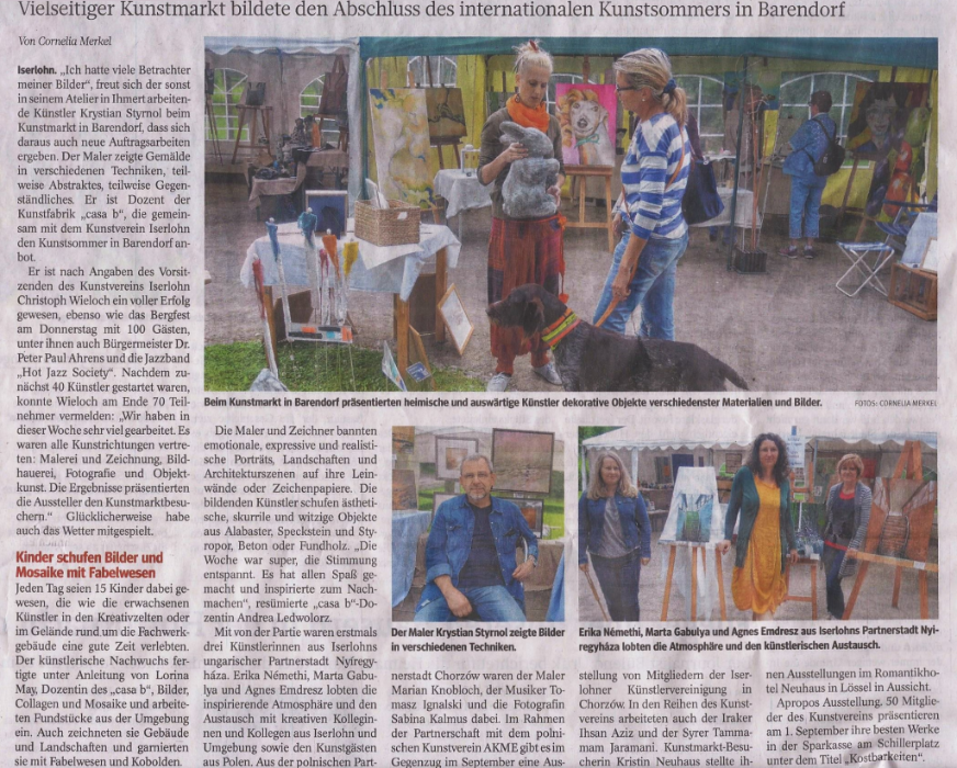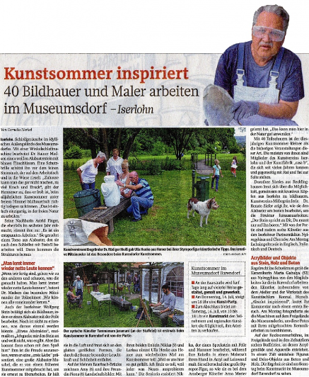 vom 11.-16.Juli 2016 war es wieder soweit: der kunstsommer in iserlohn barendorf schlug auf! künstler aus iserlohn und umgebung tragen sich eine woche lang zum gemeinsamen, bildhauerischen und malerischen arbeiten. organisiert von kunstfabrik casa b und kunstverein iserlohn konnten auch künstler ohne anbindung an die vereine teilnehmen. neben der gemeinsamen kreativen arbeit wurden auch wieder jeden vormittag workshops für kinder angeboten.