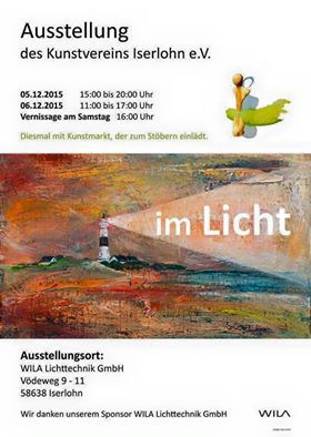 künstler des kunstvereins iserlohn zeigten ihre werke zum thema "im licht" in den räumen der firma WILA lichttechnik. der bürgermeister iserlohns eröffnete die ausstellung auf der vernissage mit einer gelungenen rede. als themenausstellung mit zusätzlichem künstlermarkt bot die gemeinschaftsausstellung diemal eine ganz neue atmosphäre. danke an alle mitwirkenden und helfer! es war eine tolle, erfolgreiche ausstellung mit positiver rückmeldung.